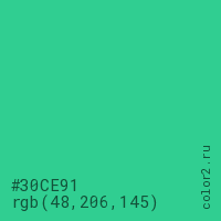 Цвет #30CE91 в цветовой модели RGB обозначается тремя октетами (48, 206, 145) в десятичном формате и #30CE91 в шестнадцатиричном (hex) формате, которые являются интенсивностью красного 48 (hex 30), интенсивность зелёного 206 (hex CE) и интенсивность синего 145 (hex 91).
