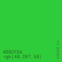 Цвет #30CF3A в цветовой модели RGB обозначается тремя октетами (48, 207, 58) в десятичном формате и #30CF3A в шестнадцатиричном (hex) формате, которые являются интенсивностью красного 48 (hex 30), интенсивность зелёного 207 (hex CF) и интенсивность синего 58 (hex 3A).
