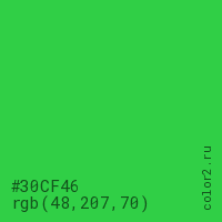 Цвет #30CF46 в цветовой модели RGB обозначается тремя октетами (48, 207, 70) в десятичном формате и #30CF46 в шестнадцатиричном (hex) формате, которые являются интенсивностью красного 48 (hex 30), интенсивность зелёного 207 (hex CF) и интенсивность синего 70 (hex 46).