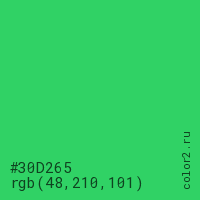 Цвет #30D265 в цветовой модели RGB обозначается тремя октетами (48, 210, 101) в десятичном формате и #30D265 в шестнадцатиричном (hex) формате, которые являются интенсивностью красного 48 (hex 30), интенсивность зелёного 210 (hex D2) и интенсивность синего 101 (hex 65).