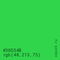 Цвет #30D54B в цветовой модели RGB обозначается тремя октетами (48, 213, 75) в десятичном формате и #30D54B в шестнадцатиричном (hex) формате, которые являются интенсивностью красного 48 (hex 30), интенсивность зелёного 213 (hex D5) и интенсивность синего 75 (hex 4B).
