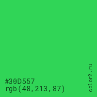 Цвет #30D557 в цветовой модели RGB обозначается тремя октетами (48, 213, 87) в десятичном формате и #30D557 в шестнадцатиричном (hex) формате, которые являются интенсивностью красного 48 (hex 30), интенсивность зелёного 213 (hex D5) и интенсивность синего 87 (hex 57).
