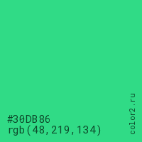 Цвет #30DB86 в цветовой модели RGB обозначается тремя октетами (48, 219, 134) в десятичном формате и #30DB86 в шестнадцатиричном (hex) формате, которые являются интенсивностью красного 48 (hex 30), интенсивность зелёного 219 (hex DB) и интенсивность синего 134 (hex 86).