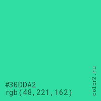 Цвет #30DDA2 в цветовой модели RGB обозначается тремя октетами (48, 221, 162) в десятичном формате и #30DDA2 в шестнадцатиричном (hex) формате, которые являются интенсивностью красного 48 (hex 30), интенсивность зелёного 221 (hex DD) и интенсивность синего 162 (hex A2).