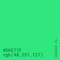 Цвет #30E77F в цветовой модели RGB обозначается тремя октетами (48, 231, 127) в десятичном формате и #30E77F в шестнадцатиричном (hex) формате, которые являются интенсивностью красного 48 (hex 30), интенсивность зелёного 231 (hex E7) и интенсивность синего 127 (hex 7F).