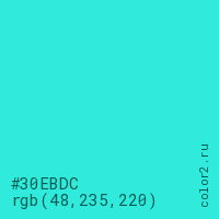 Цвет #30EBDC в цветовой модели RGB обозначается тремя октетами (48, 235, 220) в десятичном формате и #30EBDC в шестнадцатиричном (hex) формате, которые являются интенсивностью красного 48 (hex 30), интенсивность зелёного 235 (hex EB) и интенсивность синего 220 (hex DC).