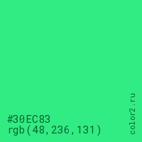 Цвет #30EC83 в цветовой модели RGB обозначается тремя октетами (48, 236, 131) в десятичном формате и #30EC83 в шестнадцатиричном (hex) формате, которые являются интенсивностью красного 48 (hex 30), интенсивность зелёного 236 (hex EC) и интенсивность синего 131 (hex 83).