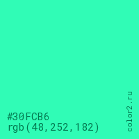 Цвет #30FCB6 в цветовой модели RGB обозначается тремя октетами (48, 252, 182) в десятичном формате и #30FCB6 в шестнадцатиричном (hex) формате, которые являются интенсивностью красного 48 (hex 30), интенсивность зелёного 252 (hex FC) и интенсивность синего 182 (hex B6).