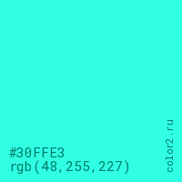Цвет #30FFE3 в цветовой модели RGB обозначается тремя октетами (48, 255, 227) в десятичном формате и #30FFE3 в шестнадцатиричном (hex) формате, которые являются интенсивностью красного 48 (hex 30), интенсивность зелёного 255 (hex FF) и интенсивность синего 227 (hex E3).