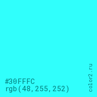 Цвет #30FFFC в цветовой модели RGB обозначается тремя октетами (48, 255, 252) в десятичном формате и #30FFFC в шестнадцатиричном (hex) формате, которые являются интенсивностью красного 48 (hex 30), интенсивность зелёного 255 (hex FF) и интенсивность синего 252 (hex FC).