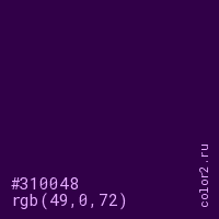 Цвет #310048 в цветовой модели RGB обозначается тремя октетами (49, 0, 72) в десятичном формате и #310048 в шестнадцатиричном (hex) формате, которые являются интенсивностью красного 49 (hex 31), интенсивность зелёного 0 (hex 00) и интенсивность синего 72 (hex 48).