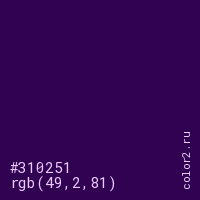 Цвет #310251 в цветовой модели RGB обозначается тремя октетами (49, 2, 81) в десятичном формате и #310251 в шестнадцатиричном (hex) формате, которые являются интенсивностью красного 49 (hex 31), интенсивность зелёного 2 (hex 02) и интенсивность синего 81 (hex 51).