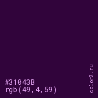 Цвет #31043B в цветовой модели RGB обозначается тремя октетами (49, 4, 59) в десятичном формате и #31043B в шестнадцатиричном (hex) формате, которые являются интенсивностью красного 49 (hex 31), интенсивность зелёного 4 (hex 04) и интенсивность синего 59 (hex 3B).