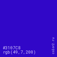 Цвет #3107C8 в цветовой модели RGB обозначается тремя октетами (49, 7, 200) в десятичном формате и #3107C8 в шестнадцатиричном (hex) формате, которые являются интенсивностью красного 49 (hex 31), интенсивность зелёного 7 (hex 07) и интенсивность синего 200 (hex C8).