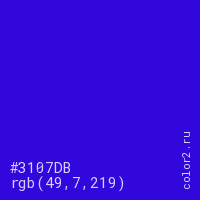 Цвет #3107DB в цветовой модели RGB обозначается тремя октетами (49, 7, 219) в десятичном формате и #3107DB в шестнадцатиричном (hex) формате, которые являются интенсивностью красного 49 (hex 31), интенсивность зелёного 7 (hex 07) и интенсивность синего 219 (hex DB).