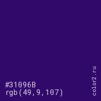 Цвет #31096B в цветовой модели RGB обозначается тремя октетами (49, 9, 107) в десятичном формате и #31096B в шестнадцатиричном (hex) формате, которые являются интенсивностью красного 49 (hex 31), интенсивность зелёного 9 (hex 09) и интенсивность синего 107 (hex 6B).