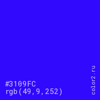 Цвет #3109FC в цветовой модели RGB обозначается тремя октетами (49, 9, 252) в десятичном формате и #3109FC в шестнадцатиричном (hex) формате, которые являются интенсивностью красного 49 (hex 31), интенсивность зелёного 9 (hex 09) и интенсивность синего 252 (hex FC).