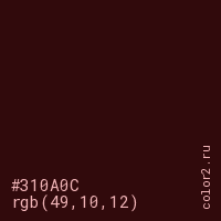 Цвет #310A0C в цветовой модели RGB обозначается тремя октетами (49, 10, 12) в десятичном формате и #310A0C в шестнадцатиричном (hex) формате, которые являются интенсивностью красного 49 (hex 31), интенсивность зелёного 10 (hex 0A) и интенсивность синего 12 (hex 0C).