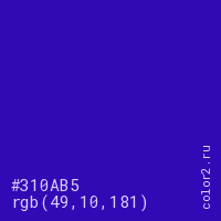 Цвет #310AB5 в цветовой модели RGB обозначается тремя октетами (49, 10, 181) в десятичном формате и #310AB5 в шестнадцатиричном (hex) формате, которые являются интенсивностью красного 49 (hex 31), интенсивность зелёного 10 (hex 0A) и интенсивность синего 181 (hex B5).
