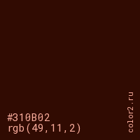 Цвет #310B02 в цветовой модели RGB обозначается тремя октетами (49, 11, 2) в десятичном формате и #310B02 в шестнадцатиричном (hex) формате, которые являются интенсивностью красного 49 (hex 31), интенсивность зелёного 11 (hex 0B) и интенсивность синего 2 (hex 02).