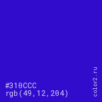 Цвет #310CCC в цветовой модели RGB обозначается тремя октетами (49, 12, 204) в десятичном формате и #310CCC в шестнадцатиричном (hex) формате, которые являются интенсивностью красного 49 (hex 31), интенсивность зелёного 12 (hex 0C) и интенсивность синего 204 (hex CC).