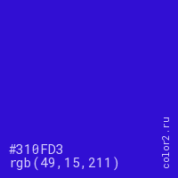 Цвет #310FD3 в цветовой модели RGB обозначается тремя октетами (49, 15, 211) в десятичном формате и #310FD3 в шестнадцатиричном (hex) формате, которые являются интенсивностью красного 49 (hex 31), интенсивность зелёного 15 (hex 0F) и интенсивность синего 211 (hex D3).