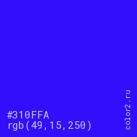 Цвет #310FFA в цветовой модели RGB обозначается тремя октетами (49, 15, 250) в десятичном формате и #310FFA в шестнадцатиричном (hex) формате, которые являются интенсивностью красного 49 (hex 31), интенсивность зелёного 15 (hex 0F) и интенсивность синего 250 (hex FA).
