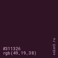 Цвет #311326 в цветовой модели RGB обозначается тремя октетами (49, 19, 38) в десятичном формате и #311326 в шестнадцатиричном (hex) формате, которые являются интенсивностью красного 49 (hex 31), интенсивность зелёного 19 (hex 13) и интенсивность синего 38 (hex 26).