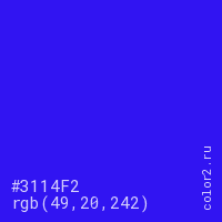 Цвет #3114F2 в цветовой модели RGB обозначается тремя октетами (49, 20, 242) в десятичном формате и #3114F2 в шестнадцатиричном (hex) формате, которые являются интенсивностью красного 49 (hex 31), интенсивность зелёного 20 (hex 14) и интенсивность синего 242 (hex F2).