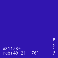 Цвет #3115B0 в цветовой модели RGB обозначается тремя октетами (49, 21, 176) в десятичном формате и #3115B0 в шестнадцатиричном (hex) формате, которые являются интенсивностью красного 49 (hex 31), интенсивность зелёного 21 (hex 15) и интенсивность синего 176 (hex B0).