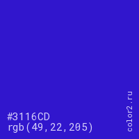 Цвет #3116CD в цветовой модели RGB обозначается тремя октетами (49, 22, 205) в десятичном формате и #3116CD в шестнадцатиричном (hex) формате, которые являются интенсивностью красного 49 (hex 31), интенсивность зелёного 22 (hex 16) и интенсивность синего 205 (hex CD).