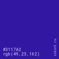 Цвет #3117A2 в цветовой модели RGB обозначается тремя октетами (49, 23, 162) в десятичном формате и #3117A2 в шестнадцатиричном (hex) формате, которые являются интенсивностью красного 49 (hex 31), интенсивность зелёного 23 (hex 17) и интенсивность синего 162 (hex A2).