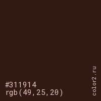 Цвет #311914 в цветовой модели RGB обозначается тремя октетами (49, 25, 20) в десятичном формате и #311914 в шестнадцатиричном (hex) формате, которые являются интенсивностью красного 49 (hex 31), интенсивность зелёного 25 (hex 19) и интенсивность синего 20 (hex 14).