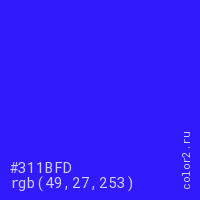 Цвет #311BFD в цветовой модели RGB обозначается тремя октетами (49, 27, 253) в десятичном формате и #311BFD в шестнадцатиричном (hex) формате, которые являются интенсивностью красного 49 (hex 31), интенсивность зелёного 27 (hex 1B) и интенсивность синего 253 (hex FD).