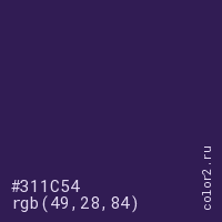 Цвет #311C54 в цветовой модели RGB обозначается тремя октетами (49, 28, 84) в десятичном формате и #311C54 в шестнадцатиричном (hex) формате, которые являются интенсивностью красного 49 (hex 31), интенсивность зелёного 28 (hex 1C) и интенсивность синего 84 (hex 54).
