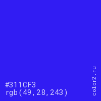 Цвет #311CF3 в цветовой модели RGB обозначается тремя октетами (49, 28, 243) в десятичном формате и #311CF3 в шестнадцатиричном (hex) формате, которые являются интенсивностью красного 49 (hex 31), интенсивность зелёного 28 (hex 1C) и интенсивность синего 243 (hex F3).