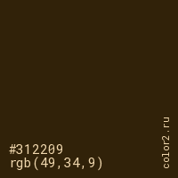 Цвет #312209 в цветовой модели RGB обозначается тремя октетами (49, 34, 9) в десятичном формате и #312209 в шестнадцатиричном (hex) формате, которые являются интенсивностью красного 49 (hex 31), интенсивность зелёного 34 (hex 22) и интенсивность синего 9 (hex 09).