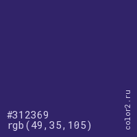 Цвет #312369 в цветовой модели RGB обозначается тремя октетами (49, 35, 105) в десятичном формате и #312369 в шестнадцатиричном (hex) формате, которые являются интенсивностью красного 49 (hex 31), интенсивность зелёного 35 (hex 23) и интенсивность синего 105 (hex 69).
