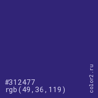 Цвет #312477 в цветовой модели RGB обозначается тремя октетами (49, 36, 119) в десятичном формате и #312477 в шестнадцатиричном (hex) формате, которые являются интенсивностью красного 49 (hex 31), интенсивность зелёного 36 (hex 24) и интенсивность синего 119 (hex 77).