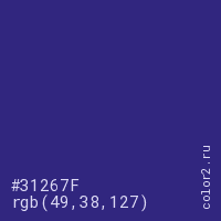 Цвет #31267F в цветовой модели RGB обозначается тремя октетами (49, 38, 127) в десятичном формате и #31267F в шестнадцатиричном (hex) формате, которые являются интенсивностью красного 49 (hex 31), интенсивность зелёного 38 (hex 26) и интенсивность синего 127 (hex 7F).