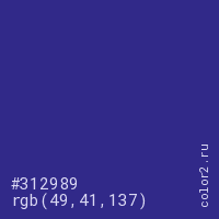Цвет #312989 в цветовой модели RGB обозначается тремя октетами (49, 41, 137) в десятичном формате и #312989 в шестнадцатиричном (hex) формате, которые являются интенсивностью красного 49 (hex 31), интенсивность зелёного 41 (hex 29) и интенсивность синего 137 (hex 89).