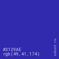 Цвет #3129AE в цветовой модели RGB обозначается тремя октетами (49, 41, 174) в десятичном формате и #3129AE в шестнадцатиричном (hex) формате, которые являются интенсивностью красного 49 (hex 31), интенсивность зелёного 41 (hex 29) и интенсивность синего 174 (hex AE).