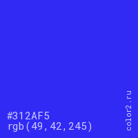 Цвет #312AF5 в цветовой модели RGB обозначается тремя октетами (49, 42, 245) в десятичном формате и #312AF5 в шестнадцатиричном (hex) формате, которые являются интенсивностью красного 49 (hex 31), интенсивность зелёного 42 (hex 2A) и интенсивность синего 245 (hex F5).