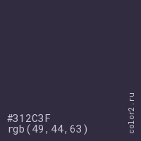 Цвет #312C3F в цветовой модели RGB обозначается тремя октетами (49, 44, 63) в десятичном формате и #312C3F в шестнадцатиричном (hex) формате, которые являются интенсивностью красного 49 (hex 31), интенсивность зелёного 44 (hex 2C) и интенсивность синего 63 (hex 3F).