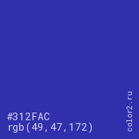 Цвет #312FAC в цветовой модели RGB обозначается тремя октетами (49, 47, 172) в десятичном формате и #312FAC в шестнадцатиричном (hex) формате, которые являются интенсивностью красного 49 (hex 31), интенсивность зелёного 47 (hex 2F) и интенсивность синего 172 (hex AC).
