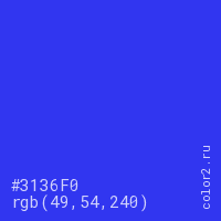 Цвет #3136F0 в цветовой модели RGB обозначается тремя октетами (49, 54, 240) в десятичном формате и #3136F0 в шестнадцатиричном (hex) формате, которые являются интенсивностью красного 49 (hex 31), интенсивность зелёного 54 (hex 36) и интенсивность синего 240 (hex F0).