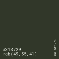 Цвет #313729 в цветовой модели RGB обозначается тремя октетами (49, 55, 41) в десятичном формате и #313729 в шестнадцатиричном (hex) формате, которые являются интенсивностью красного 49 (hex 31), интенсивность зелёного 55 (hex 37) и интенсивность синего 41 (hex 29).