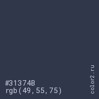Цвет #31374B в цветовой модели RGB обозначается тремя октетами (49, 55, 75) в десятичном формате и #31374B в шестнадцатиричном (hex) формате, которые являются интенсивностью красного 49 (hex 31), интенсивность зелёного 55 (hex 37) и интенсивность синего 75 (hex 4B).