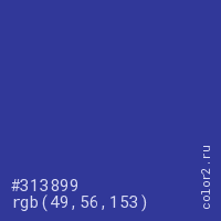 Цвет #313899 в цветовой модели RGB обозначается тремя октетами (49, 56, 153) в десятичном формате и #313899 в шестнадцатиричном (hex) формате, которые являются интенсивностью красного 49 (hex 31), интенсивность зелёного 56 (hex 38) и интенсивность синего 153 (hex 99).