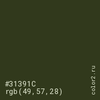 Цвет #31391C в цветовой модели RGB обозначается тремя октетами (49, 57, 28) в десятичном формате и #31391C в шестнадцатиричном (hex) формате, которые являются интенсивностью красного 49 (hex 31), интенсивность зелёного 57 (hex 39) и интенсивность синего 28 (hex 1C).